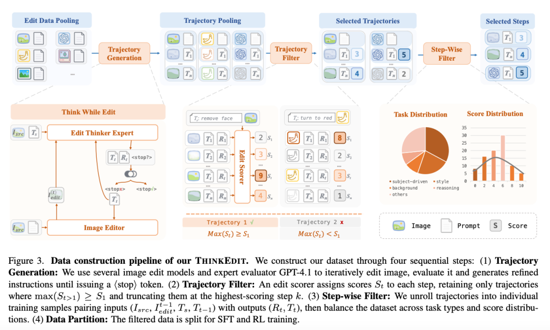 为了训练 EditThinker,本文需要一个高质量的数据集来捕获多轮“思考即编辑”循环。如下图 3 所示,本文设计了一个自动化数据构建管道来模拟这个过程,包括四个顺序步骤:轨迹生成、轨迹过滤、分步过滤和数据划分。这个管道使本文能够构建 THINKEDIT-140k 数据集。下面详细介绍每个步骤。