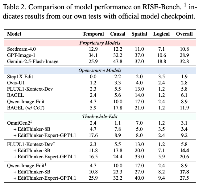 本文提出了一个深思熟虑的编辑框架 EditThinker,它使图像编辑模型能够在编辑时“思考”,解决了现有单轮方法中由于固有的随机性和缺乏深思熟虑而导致的指令遵循能力有限的问题。本文的框架通过模拟迭代的“批判-改进-重复”循环来模仿人类的认知过程,从而实现自我纠正的图像编辑。通过将 EditThinker 训练为一个统一的多模态大语言模型 (MLLM),它能够联合生成批判分数、详细推理过程和改进后的指令。本文还引入了 THINKEDIT-140k,一个用于监督微调 (SFT) 和强化学习 (RL) 的大规模、多轮数据集,以将 EditThinker 的规划能力与实际编辑器的限制对齐。在 ImgEdit-Bench、GEdit-Bench、RISE-Bench 和 Kris-Bench 等四个广泛使用的基准上进行的综合实验表明,EditThinker 显著提高了现有图像编辑模型的指令遵循能力,特别是在需要复杂推理的任务中。消融研究进一步证实了“思考即编辑”范式、迭代推理轮次、两阶段训练策略和专家模型能力的关键贡献。本文的研究结果强调了将深思熟虑和迭代推理整合到图像编辑工作流中的重要性,为开发更智能、更稳健的交互式视觉系统铺平了道路。本文计划发布所有数据集和模型,以促进该领域的进一步研究。