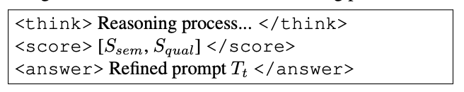 使用专家 (GPT-4.1) 演示数据集(详见第 4 节),基础 MLLM 学习采用本文的结构化 I/O 格式(例如,<think>、<score>、<answer>),模仿专家的推理风格,并理解批判和细化指令的原则。