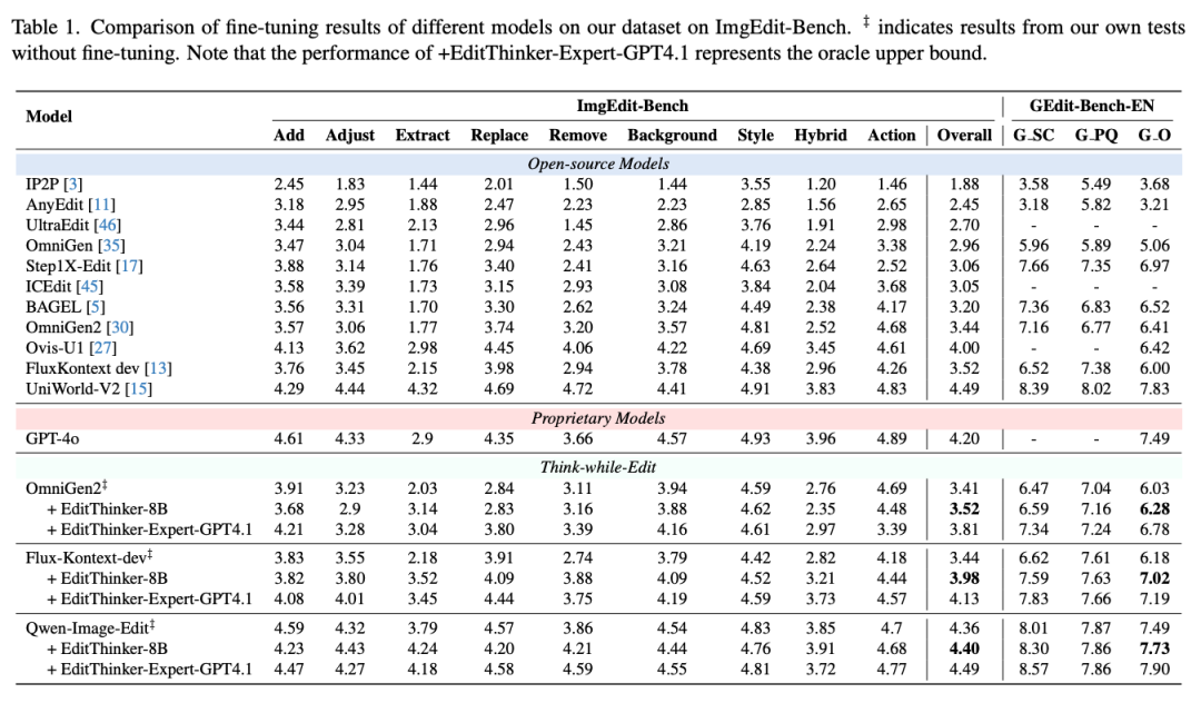基准和基线:为了全面验证“思考即编辑”范式的有效性,本文在四个不同的基准上进行了综合评估:ImgEdit-Bench、GEdit-Bench 、RISEBench和 KRIS-Bench。选择这套基准是为了进行多方面的评估,其中 RISEBench 和 KRIS-Bench 专门侧重于评估编辑模型的推理能力。