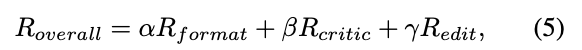 为了弥合这一差距,本文引入了一个 RL 阶段,该阶段根据实际编辑反馈优化 EditThinker。本文采用标准 GRPO(组相对策略优化),并设计了一个精心设计的奖励函数。如前文所述,EditThinker 充当双重角色代理(即,评论者和细化者),本文设计了一个多组件奖励,为这两个方面提供学习信号,如下所示: