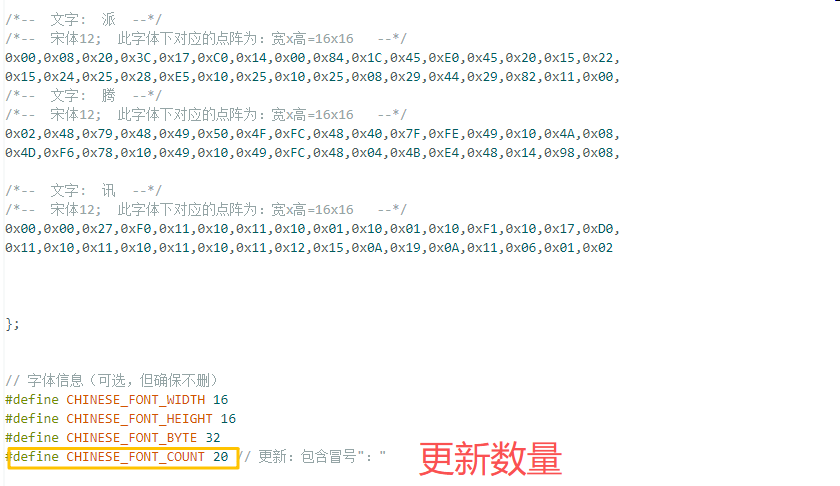 复制汉字信息到MyChineseFont.h文件,并更新CHINESE_FONT_COUNT的值。如,有21个字符,这里就是21。