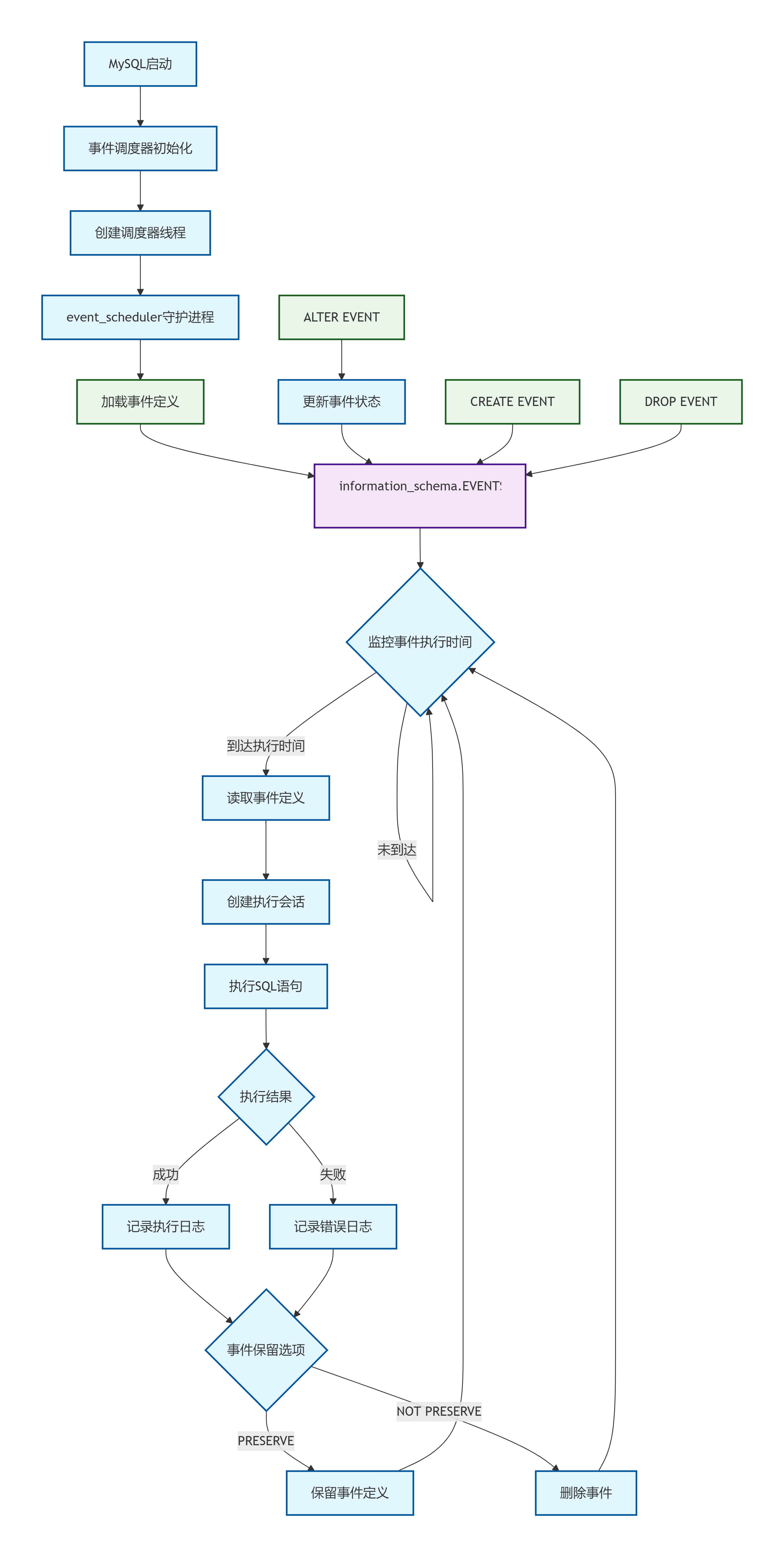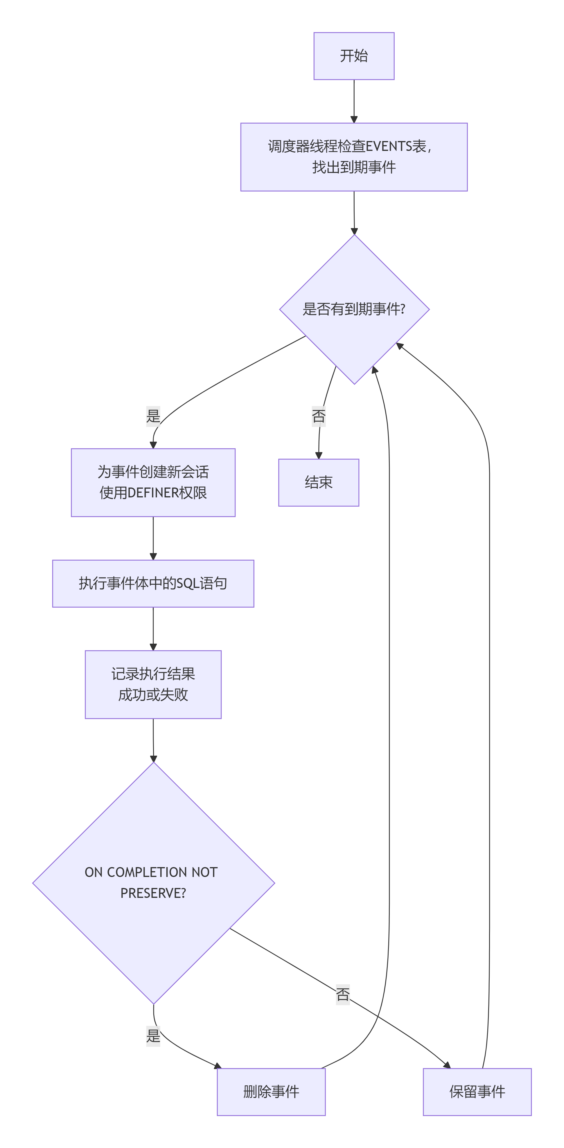 事件执行引擎:当到达预定时间点时,调度器线程会从EVENTS表中读取待执行的事件,然后在当前会话中执行事件体中的SQL语句。