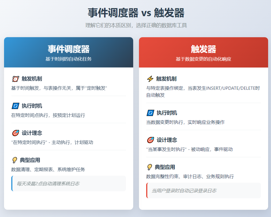 触发器是"当某事发生时执行",而事件调度器是"在特定时间点执行"。例如,当用户登录时记录日志是触发器的用法,而每天凌晨2点清理日志则是事件调度器的用法。
