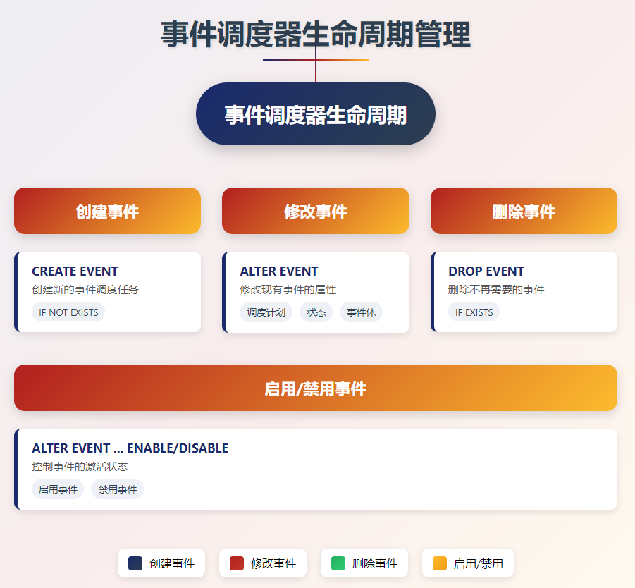 CREATE EVENT,可指定唯一性(IF NOT EXISTS)ALTER EVENT,可修改调度计划、状态、事件体DROP EVENT,可安全删除(IF EXISTS)ALTER EVENT ... ENABLE/DISABLE