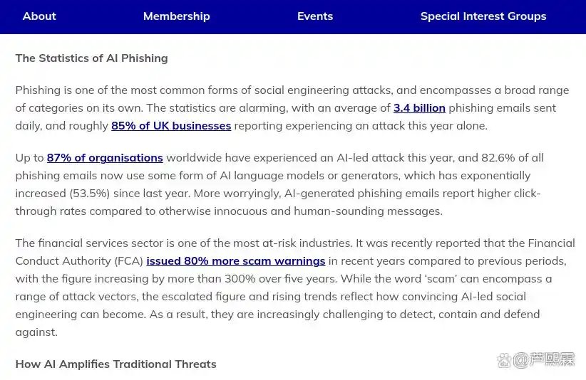 钓鱼攻击作为一种典型的社会工程学手段,其核心在于利用人类心理弱点诱导受害者泄露敏感信息或执行有害操作。长期以来,此类攻击因内容粗糙、语法错误频出、缺乏上下文关联而易于识别。然而,随着生成式人工智能(Generative AI)尤其是大语言模型(Large Language Models, LLMs)的普及,攻击者得以低成本、高效率地生成高度逼真、语义连贯且上下文相关的欺骗性内容。据2025年英国国家网络安全中心(NCSC)报告,超过82%的钓鱼邮件已采用某种形式的AI生成技术,其点击率较传统钓鱼高出近40%。