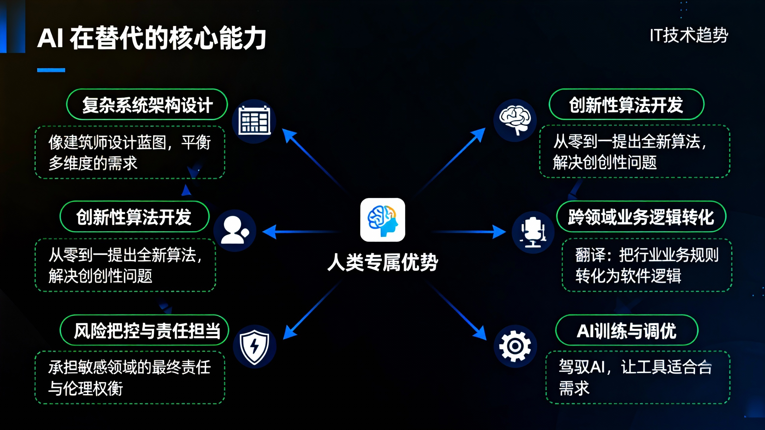 尽管AI在标准化工作中表现出色,但它的能力边界依然清晰。IT工作的核心价值,从来不是“重复劳动”,而是“创造性解决问题”。那些依赖抽象思维、创造力、业务理解和责任担当的能力,始终是人类的专属优势。