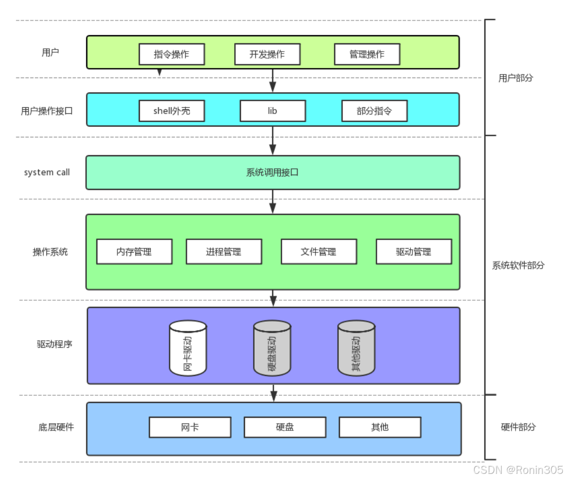 操作系统(OS)是计算机底层硬件的统一管控层,由内核(Kernel) 和支撑性程序(如Shell、函数库)组成。 类比: 若将计算机硬件比作一座工厂(CPU是工人、内存是工作台、硬盘是仓库),操作系统就是厂长——指挥工人使用工具搬运原料、调度生产流程、协调各部门运作。