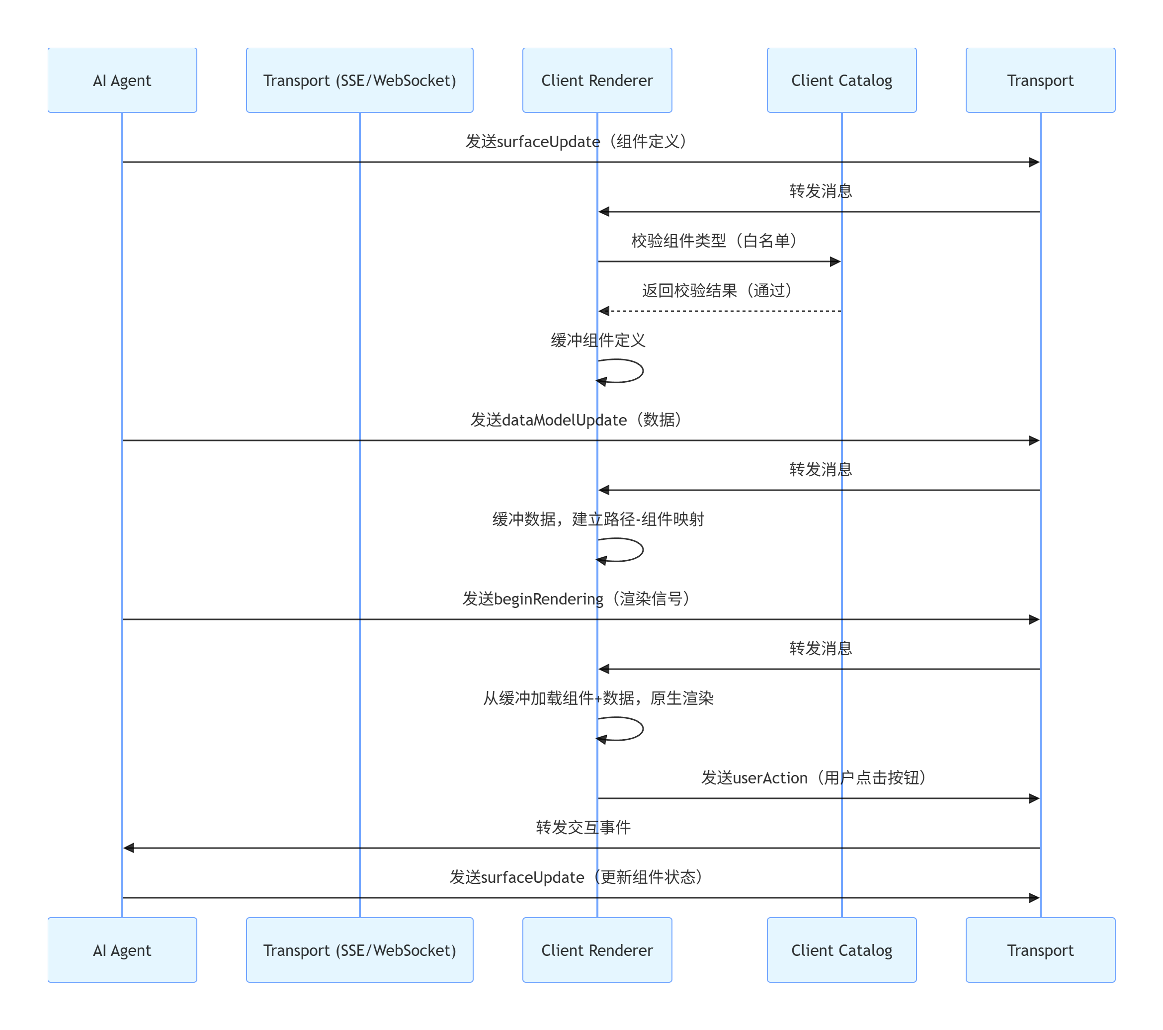 安全逻辑:AI发送surfaceUpdate后,客户端先校验组件类型是否在Catalog中,不存在则直接丢弃——从根源杜绝恶意组件注入。