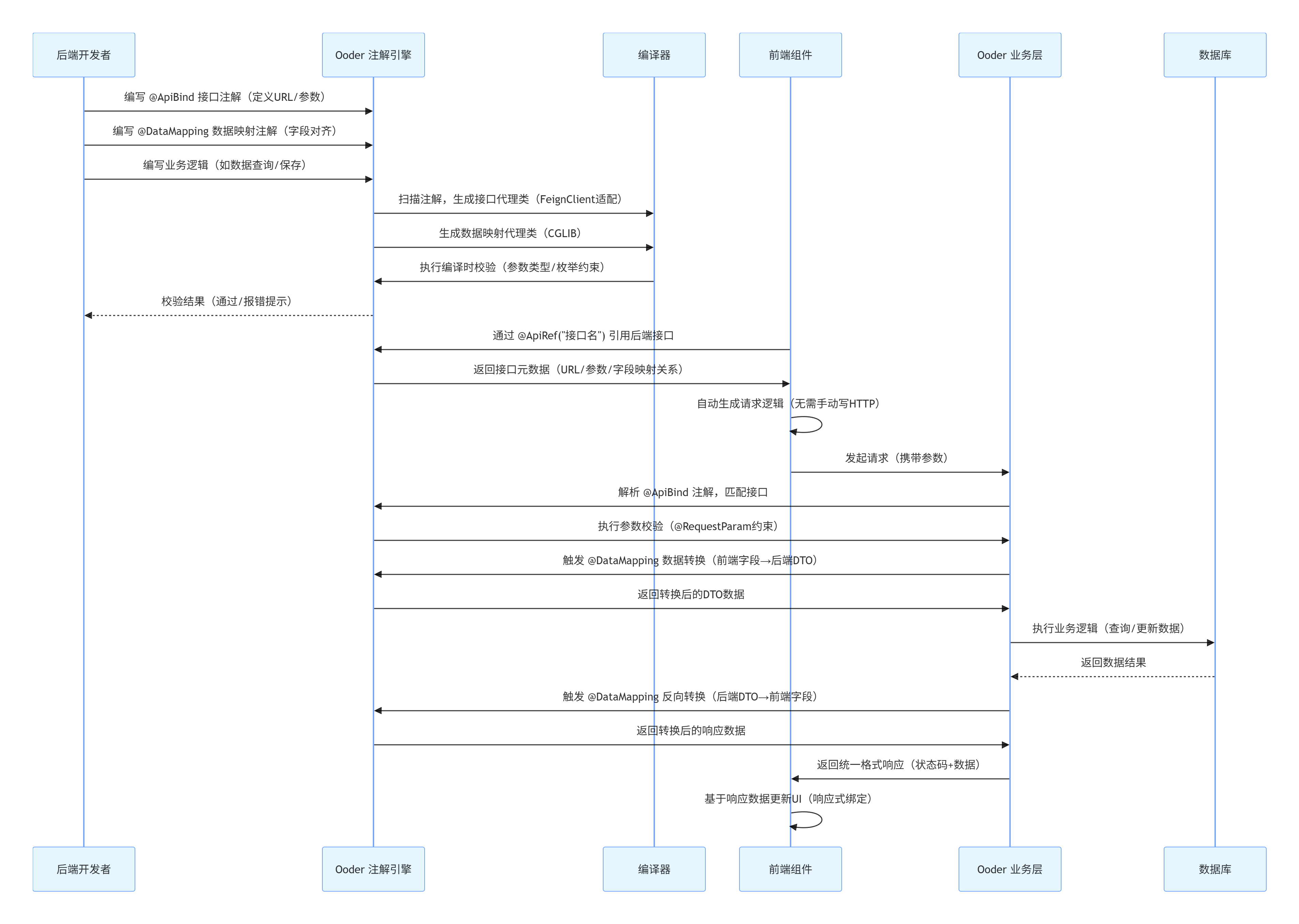 传统全栈开发的痛点在于“前后端对接碎片化”:前端写请求代码、后端写接口文档、字段映射需手动适配。OOD的解法是“注解驱动全栈衔接”: