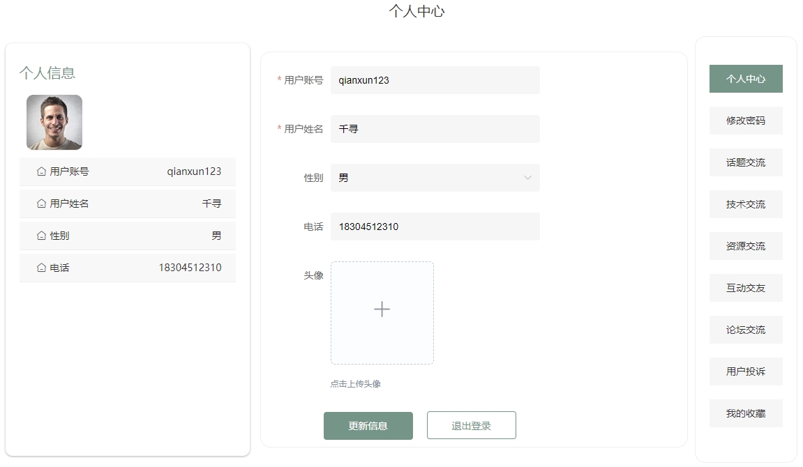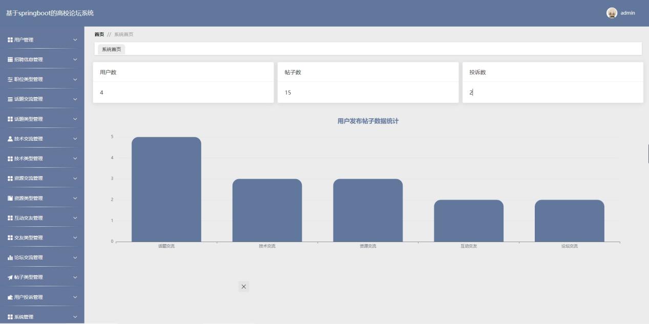 管理员可进行信息统计,对用户、帖子、投诉信息、管理员信息、系统进行管理。