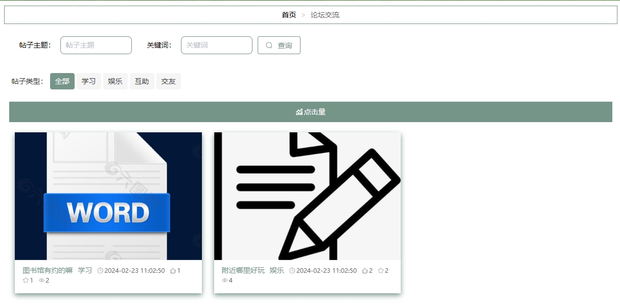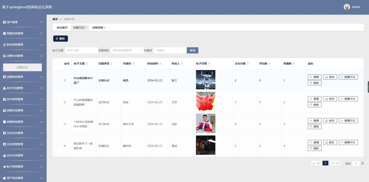 本文设计出一款基于SpringBoot技术的高校论坛系统。系统可提供信息的发布与交流更便利、及时、清楚等功能的同时,用户获取信息、交友与分享生活的日常琐事、心情感受、学习成长等的需求能够得到实现。校方也能通过校园信息交流更及时全面地了解用户的心理及生活情况。系统功能主要有用户的登录和访客注册、搜索、浏览和发布帖子并进行点赞、评论、收藏等以及管理员管理用户、帖子、系统。