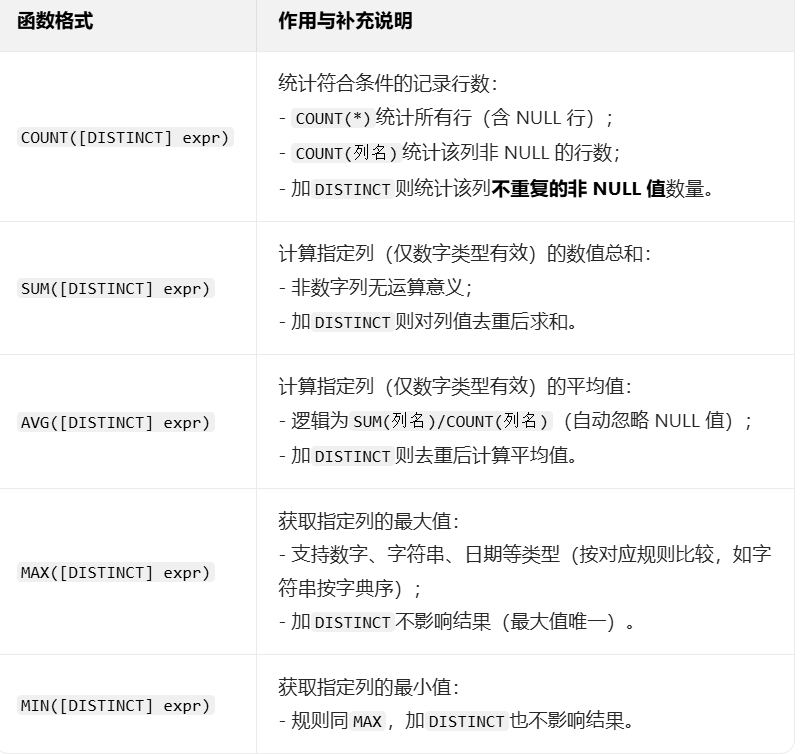 1.COUNT 函数格式:COUNT([DISTINCT] expr)作用:统计查询结果中符合条件的记录行数。注意:①使用COUNT(*)时,会统计所有行(包含字段值为 NULL 的行);②使用COUNT(列名)时,仅统计该列中值不为 NULL 的行数;③添加DISTINCT关键字,会统计该列中不重复的非 NULL 值对应的行数。