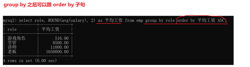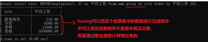 问题:对分组之后的结果进行过滤,比如说,找出平均工资大于1万的角色