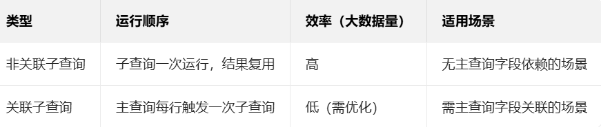 );之前的示例中包含两种隐性逻辑,这是子查询的进阶分类,决定了查询效率: