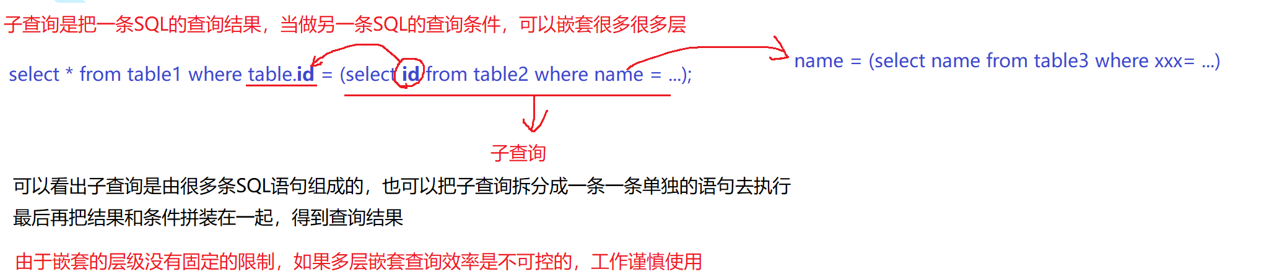 select * from student1;子查询的本质是「嵌套在主查询中的小型查询」,其用法完全由两个因素决定: