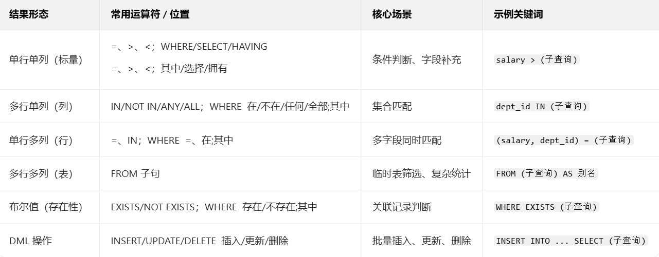 下面先按「结果形态」划分核心类型(最易理解),再补充「特殊嵌套位置」的子查询,最后附性能优化和避坑指南。