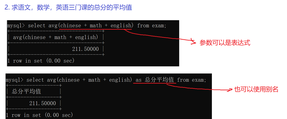 3.AVG 函数格式:AVG([DISTINCT] expr)作用:计算指定列的平均值(仅对数字类型的列有效,非数字列无运算意义)。注意:①计算逻辑为 “该列数值总和 ÷ 该列非 NULL 值的行数”(自动忽略 NULL 值);②添加DISTINCT关键字时,会先对列值去重,再基于去重后的数据计算平均值。