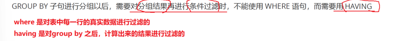 HAVING:过滤分组后的结果对GROUP BY计算出的分组结果(比如 “每个部门的员工数”)进行条件判断,只保留符合HAVING条件的分组(比如 “员工数≥2 的部门”)。