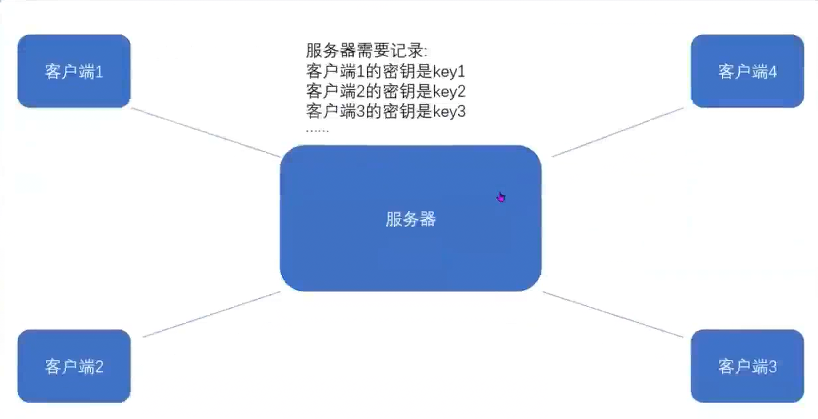 但事情没这么简单.服务器同⼀时刻其实是给很多客户端提供服务的.这么多客户端,每个⼈⽤的秘钥都 必须是不同的(如果是相同那密钥就太容易扩散了,黑客就也能拿到了).因此服务器就需要维护每个客户 端和每个密钥之间的关联关系,这也是个很⿇烦的事情~