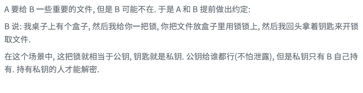 但是要想对密钥进行对称加密,就仍然需要先协商确定⼀个"密钥的密钥".这就成了"先有鸡还是先有 蛋"的问题了.此时密钥的传输再用对称加密就行不通了.