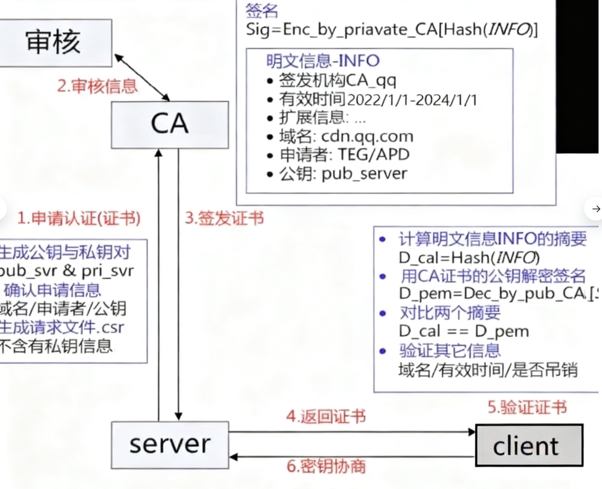 当服务端申请CA证书的时候,CA机构会对该服务端进⾏审核,并专⻔为该⽹站形成数字签名,过程如 下:
