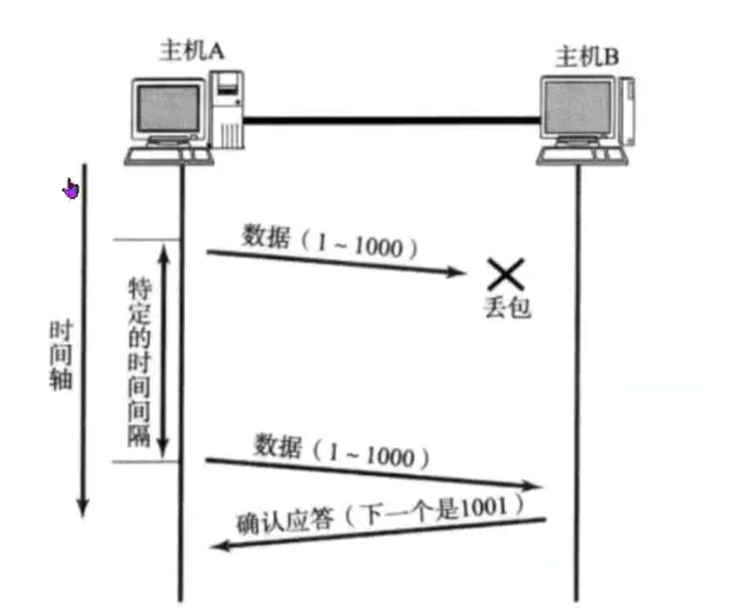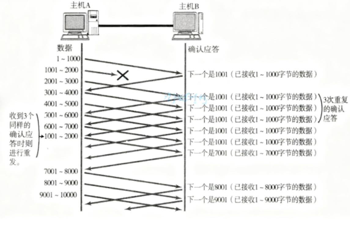 • 如果发送端主机连续三次收到了同样⼀个"1001"这样的应答,就会将对应的数据1001-2000重新 发送;