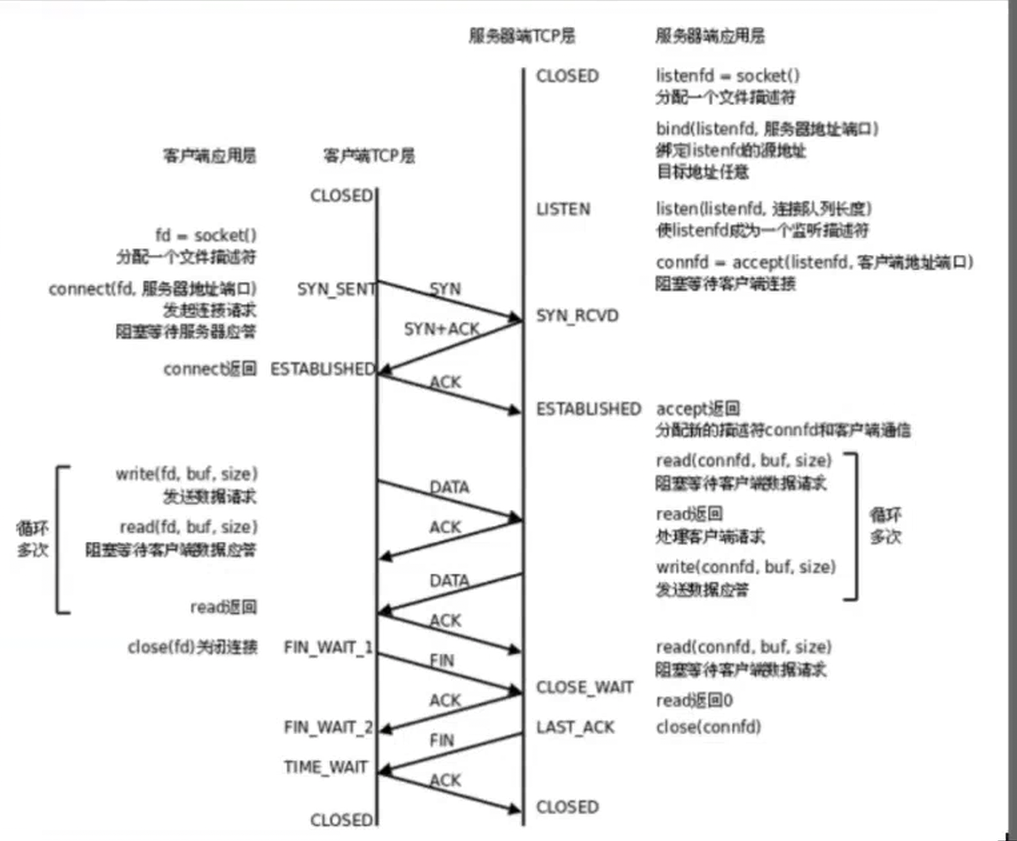close(fd) 触发连接关闭,此时左侧进入 FIN_WAIT_1 状态;CLOSE_WAIT 状态;read(connfd, buf, size) 阻塞等待客户端的数据请求(直到 read 返回 0,才知道对方已停止发送数据)。FIN_WAIT_2 状态,等待右侧发送自己的 FIN 报文。read 返回 0(表示 “对方已无数据发送”),于是调用 close(connfd);LAST_ACK 状态。TIME_WAIT 状态(需等待2 倍 MSL(报文最大生存时间),防止最后一个 ACK 丢失导致右侧重发 FIN)。TIME_WAIT 超时后,进入 CLOSED 状态;CLOSED 状态。close 才会发送 FIN;TIME_WAIT状态需等待2 倍 MSL(即2*MSL),原因是: 例子必要性:(TIME_WAIT)