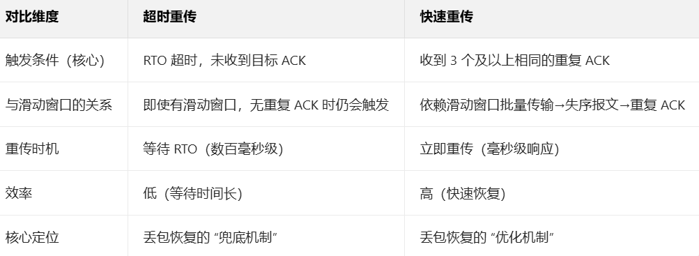 滑动窗口是默认机制,数据量决定了 “是否易产生重复 ACK”,进而影响重传方式 —— 超时重传是 “无重复 ACK 时的兜底”,快速重传是 “有重复 ACK 时的优化”,二者协同保障 TCP 的可靠传输。