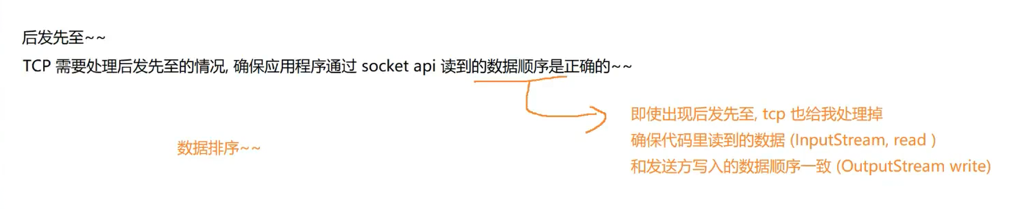 TCP需要处理后发先至的问题,确保应用程序,通过socket api读取到的数据顺序是正确的