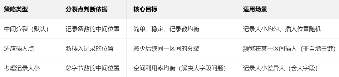 解决 “记录大小差异大” 的问题(比如表中有大字段 VARCHAR、TEXT),避免按条数分裂导致的 “空间浪费” 或 “一侧过载”。