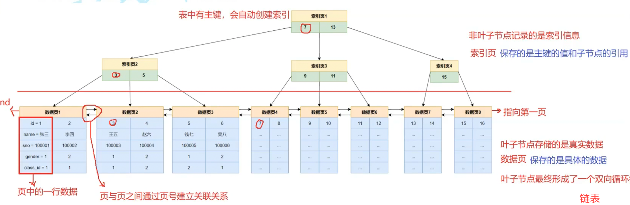 7、13→ 因为5 < 7,所以确定目标在 “左孩子节点(索引页 2)”;3、5→ 找到5对应的索引记录,这条记录直接关联了 “id=5 所在的数据页(数据页 3)” 的页号;注意:所有关于页的操作和访问都是在内存中进行的