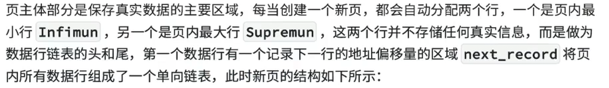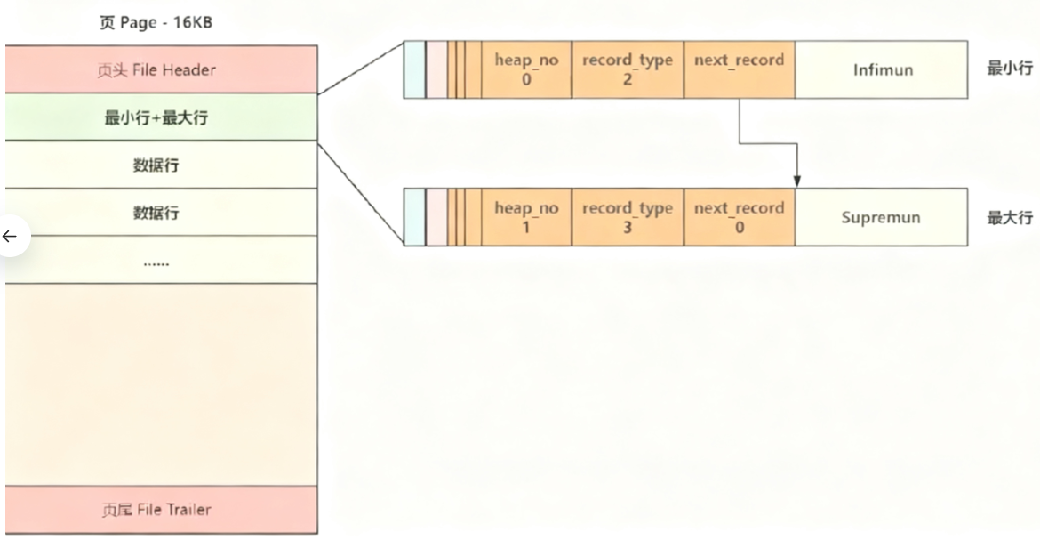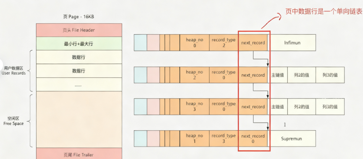 当向⼀个新页插入数据时,将 Infimun 连接第⼀个数据行,最后⼀行真实数据行连接 Supremun ,这样数据行就构建成了⼀个单向链表,更多的行数据插入后,会按照主键从小到大 的顺序进行链接,如下图所示