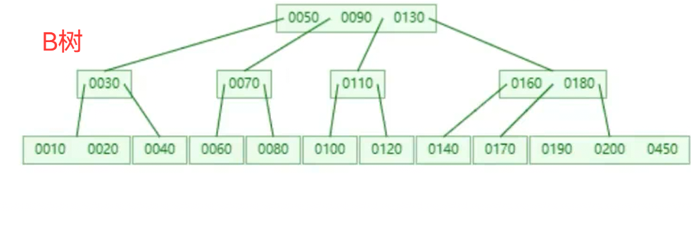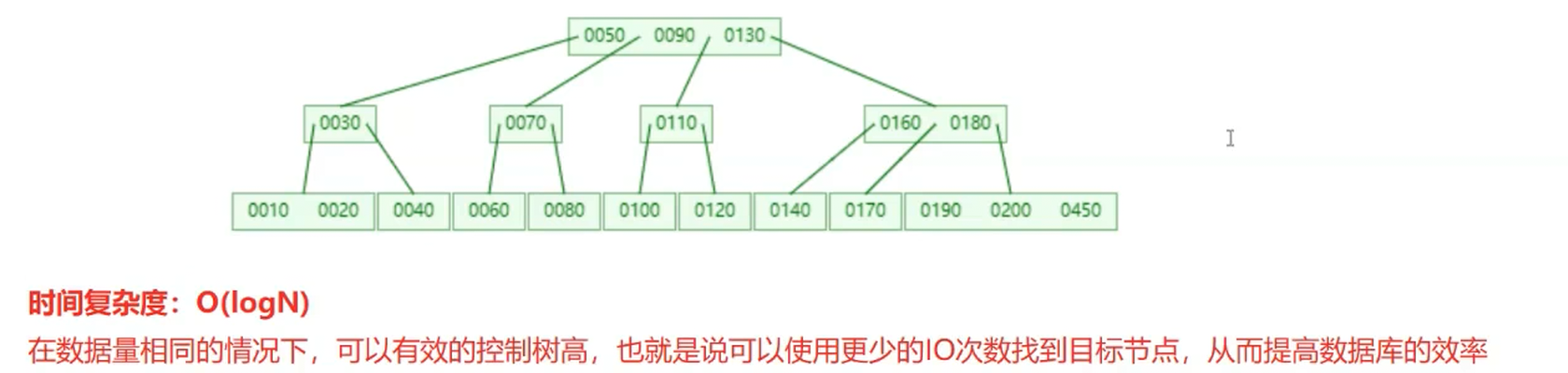 0050、0090、0130,对应 4 个子节点),实际子节点数一般小于度的值。多叉树的操作时间复杂度稳定为O(logN)(此处 log 的底数为节点的度):在数据量相同的情况下,树高被严格压缩 —— 而数据库数据存储在磁盘中,树高越低,访问目标节点所需的磁盘 IO 次数越少,因此能大幅提升数据库的查询、插入效率。
