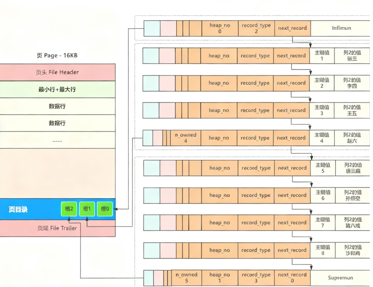 具体实现方式是,在每⼀个页中加入⼀个叫做页目录 Page Directory 的结构,将页内包括头 行、尾行在内的所有行进行分组,约定头行(最小行)单独为⼀组,其他每个组最多8条数据,同时把每个组 最后⼀行(最大行)在页中的地址放到最后一个组了,按主键从小到大的顺序记录在页目录中在,页目录中的每⼀个位置称为⼀ 个槽,每个槽都对应了⼀个分组,⼀旦分组中的数据行超过分组的上限8个时,就会分裂出⼀个新 的分组,槽里存的都是组里的最后一个。
