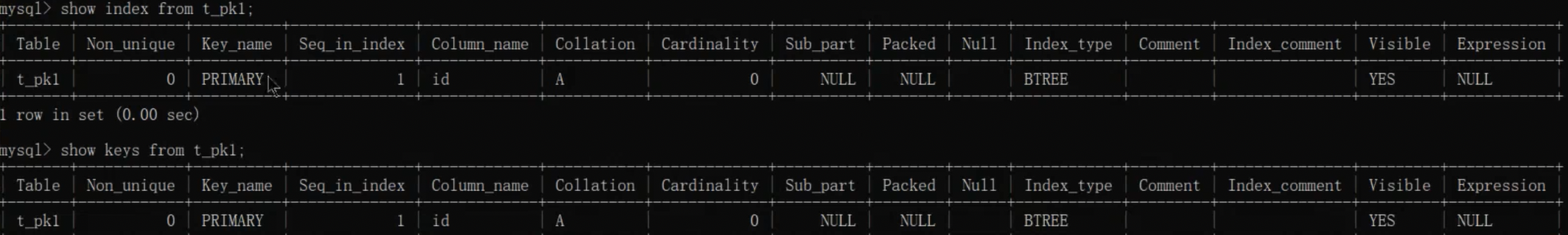 ALTER TABLE t_test_pk_auto DROP PRIMARY KEY;唯一索引、普通索引、复合索引(包括多列组合的唯一 / 普通索引)共用两套等价语法,核心是指定「索引名」。
