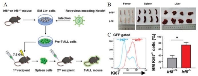 图 2 A. 建立T-ALL小鼠模型的程序。B. 移植了Irf8-/-和Irf8+/+脾细胞的小鼠在移植后两周时的股骨、脾脏和肝脏图像。C. 移植两周后,Irf8-/-组和Irf8+/+组GFP+门控骨髓细胞的Ki67表达情况。