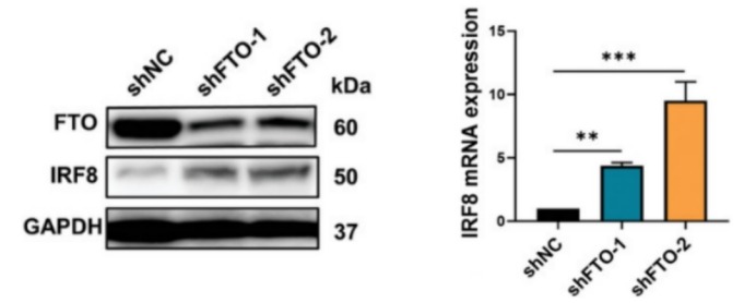 图 6 A. 通过Western印迹检测转染FTO shRNA慢病毒(shFTO-1和shFTO-2)或阴性对照(shNC)的Molt4细胞中FTO和IRF8的水平。B. 转染shFTO-1、shFTO-2或shNC慢病毒的Molt4细胞中IRF8 mRNA水平的qRT-PCR分析。