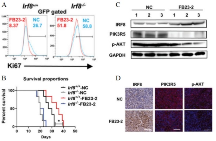 图 11 A. 流式细胞仪测定的GFP+门控骨髓细胞的Ki67表达水平。B. 用FB23-2或DMSO(NC)处理的Irf8-/-组和Irf8+/+组小鼠的存活率。C. 免疫印迹分析FB23-2或DMSO(NC)处理的Irf8+/+T-ALL小鼠骨髓中的IRF8、PIK3R5和p-AKT水平。D. 给药FB23-2或DMSO(NC)后Irf8+/+T-ALL小鼠脾脏中IRF8、PIK3R5和p-AKT表达的免疫荧光图片。