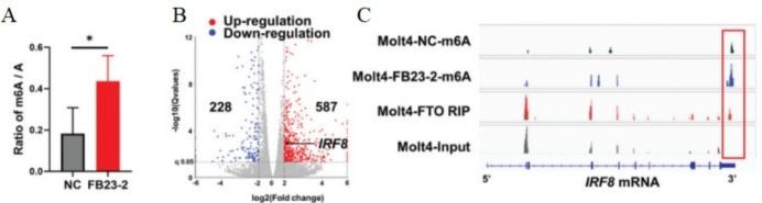 图 7 A. 用2 µm FB23-2或DMSO(NC)培养48小时的Molt4细胞中mRNA的总体m6A丰度,并用LC-MS/MS描述m6A/A的比率。B. DEGs的火山图;IRF8用黑点标出。蓝点:下调基因;红点:上调基因。C. Integrative Genomics Viewer (IGV)追踪描绘用DMSO载体或FB23-2处理的Molt4细胞中IRF8基因的m6A修饰,以及IRF8基因座中的FTO RIP-seq信号和相应的输入信号。