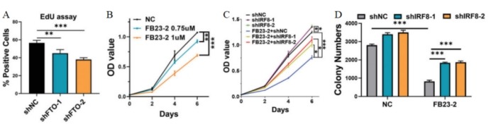 研究人员使用FB23-2抑制FTO的活性,发现IRF8的表达水平升高,细胞增殖受到FB23-2剂量依赖性抑制(图10A-B),并可以通过敲除IRF8得到有效缓解。进一步研究发现,FB23-2处理和IRF8敲除之间在细胞活力(图10C)和集落形成活性(图10D)方面具有明显的交互作用,说明IRF8的表达受到FTO介导的m6A修饰的负调控。