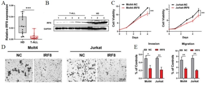图 1 A. 通过qRT-PCR检测新诊断的T-ALL患病受试者和健康供体骨髓中IRF8的表达。B. 通过免疫印迹法检测新诊断的T-ALL患病受试者和健康供体骨髓中IRF8的表达。C. 通过CCK8试验分析IRF8表达的Molt4细胞、Jurkat细胞和NCs的增殖情况。D. 过表达IRF8的Molt4和Jurkat细胞,以及NC细胞在Matrigel基质膜下的结晶紫染色。E. 过表达IRF8的Molt4细胞和NC的侵袭和迁移能力。