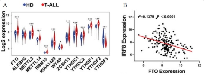 图 5 A. T-ALL患病受试者和健康供体(HDs)骨髓中m6A调节因子的Log2表达值。B. 来自GSE13159的174份T-ALL样本中FTO和IRF8表达水平的相关性,Pearson相关性分析。