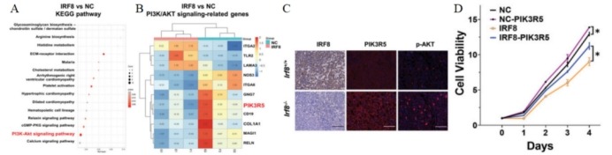 图 3 A. KEGG分析显示,与阴性对照(NC)Molt4细胞相比,RNA-seq检测到IRF8表达的Molt4细胞中PI3K/AKT通路富集。B. 热图显示了IRF8表达的Molt4细胞(E1、F1、G1)和阴性对照(NC)Molt4细胞(E2、F2、G2)中与PI3K/AKT信号相关的DEGs。PIK3R5被确定为DEG。C. Irf8-/-和Irf8+/+ T-ALL小鼠脾脏中IRF8、PIK3R5和p-AKT表达的免疫荧光结果。D. PIK3R5过表达对Molt4-NC和Molt4-IRF8细胞活力的影响。