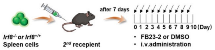 图 9 建立Irf8-/-和Irf8+/+ T-ALL小鼠模型及FB23-2给药时间表(FB23-2:2 mg/kg)。