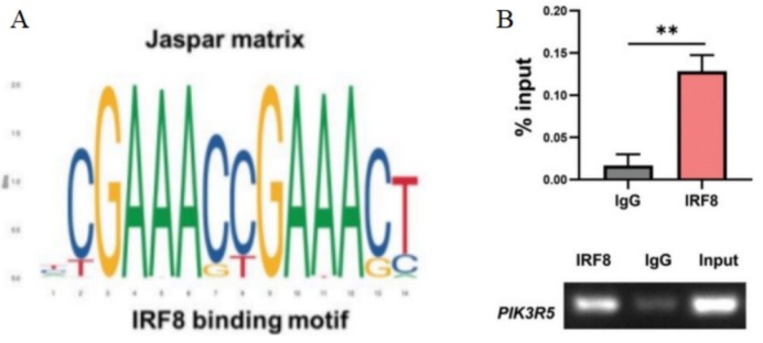图 4 A. Jaspar数据库预测的PIK3R5启动子区域中可与IRF8结合的潜在基团。B. Molt4细胞中PIK3R5的ChIP‐qPCR分析和相应的电泳图谱。