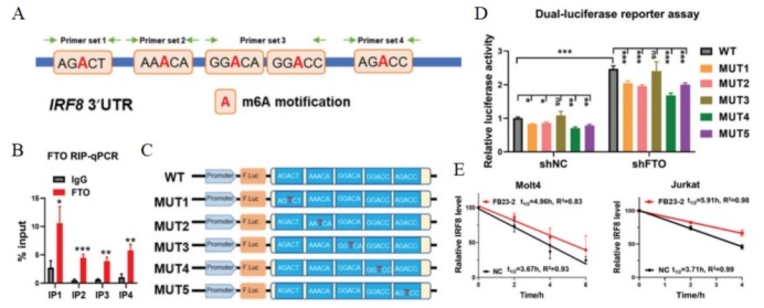 引物组3(IP3)包括两个位点:位点3和位点4。B. FTO RIP-qPCR分析显示FTO与Molt4细胞中IRF8 mRNA转录本结合。C. 克隆到pMIR-REPORT荧光素酶载体的IRF8 mRNA 3′ UTR野生型(WT)以及m6A识别位点从A核苷酸突变为T核苷酸的五个突变序列(MUT1至MUT5)示意图。D. 野生型IRF8 mRNA 3′ UTR(WT)和突变型IRF8 mRNA 3′ UTR(MUT1至MUT5)报告载体转染有或无FTO敲除的HEK293T细胞的相对荧光素酶活性。E. 用5 µm FB23-2或DMSO(NC)预处理Molt4和Jurkat细胞24小时,并在指定时间用5 µg/mL Actinomycin D培养的IRF8 mRNA降解检测,并与0小时的mRNA水平归一化。