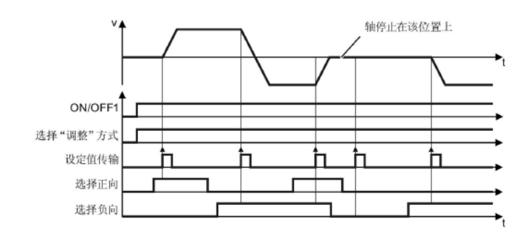 选择调整模式,给出 ON/OFF1 命令后轴使能,选择调整方向,给出设定值传输(接收设定值)上升沿后轴开始按照设定方向以设定的速度移动,再次接收到设定值传输上升沿时若方向信号发生改变则改变方向,若正向和反向信号均被选择或均不选择时则停止。