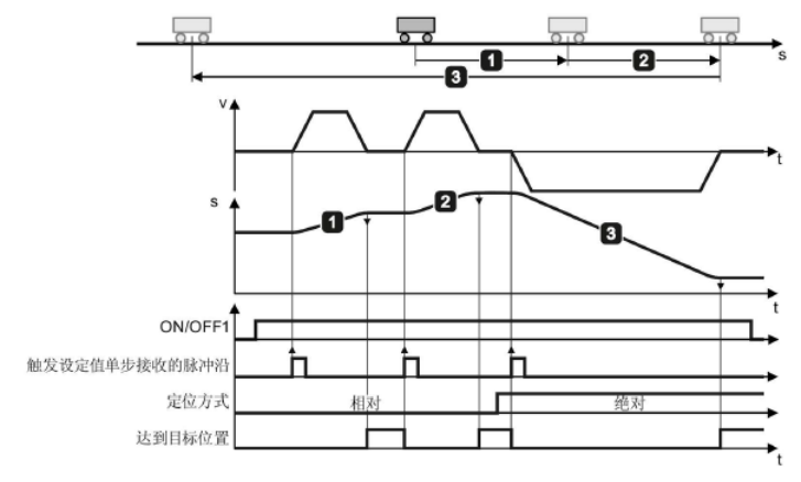 给出 ON/OFF1 命令后轴使能,给出设定值传输(接收设定值)上升沿后轴进行 相对定位或绝对定位(依据选择的定位类型),移动到目标位置后自动停止,变 频器置位达到目标位置信号。再次接收到设定值传输上升沿时再次移动。