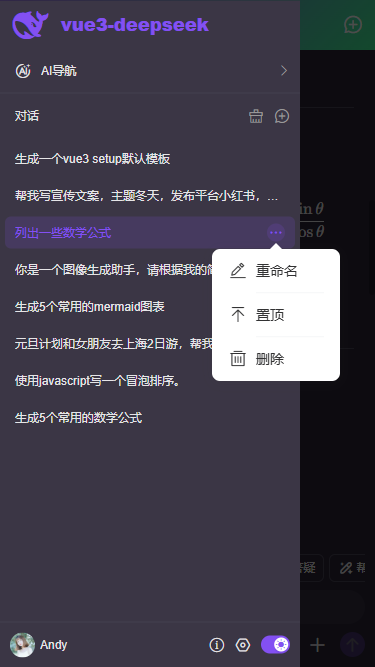 vue3.5-deepseek支持浅色/深色模式、代码高亮/复制、katex公式/mermaid图表等功能。